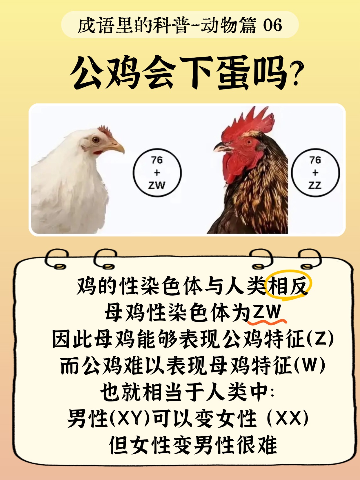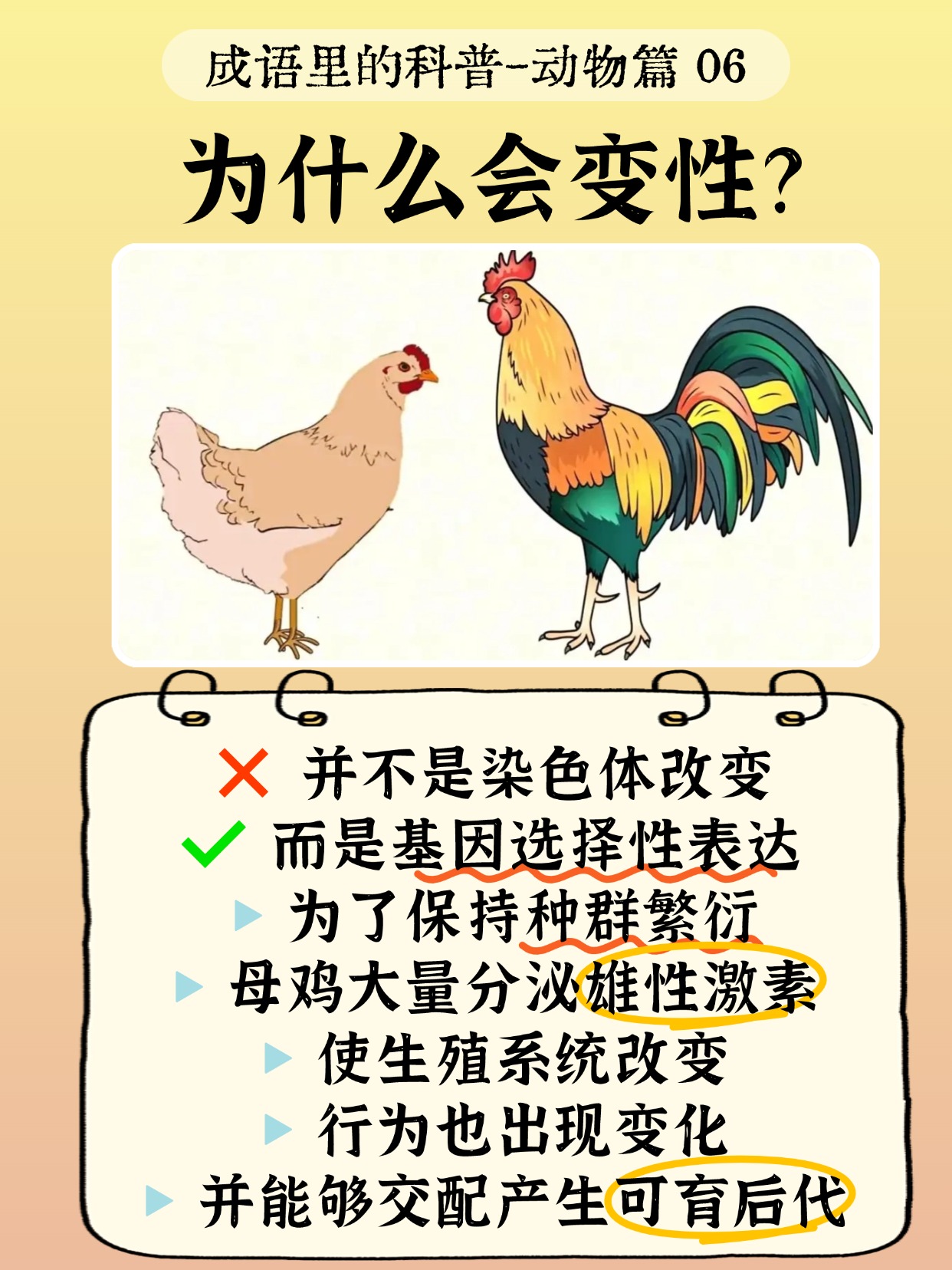 "牝鸡司晨,家之不详"——还记得《甄嬛传》里大臣们跪地痛陈"熹贵妃若为皇太后,必致牝鸡司晨"吗?古人眼中颠覆纲常的凶兆,竟藏着鸡界的生存黑科技! 【宫斗剧预言成真?母鸡真的能"夺权"!】 • 现象实录:当鸡群失去公鸡,每2000只母鸡中就可能有1只会"变性"(性反转现象)——褪去灰褐羽毛,长出鲜红鸡冠,每天清晨准时打鸣,甚至追着其他母鸡"求偶"! • 科学真相:这不是被狐狸精附体!而是母鸡启动"应急繁殖程序":卵巢退化→睾丸发育→雄性激素暴涨,3个月完成性别重塑 • 进化智慧:野生鸡群失去公鸡时,性反转能快速恢复繁殖能力,堪称"种群续命符" 【鸡界性别大反转:ZW系统的神奇操作】 • 染色体玄机:母鸡ZW染色体自带"反转开关",公鸡ZZ却难变母鸡(类似人类女性XX难变男性XY) • 可育之谜:虽然精子质量只有正常公鸡1/5,但依然能生出健康小鸡——生命总能找到出路! 【从宫斗诅咒到生存英雄:母鸡的逆袭】 • 古代误解:商纣王听信妲己被比作"牝鸡司晨",实则母鸡变性是为保护鸡群 • 现代启示:养殖场最头疼的"刺头鸡",竟是自然界最伟大的"救世主" • 医学彩蛋:鸡的性反转机制,正在帮科学家攻克人类性别发育障碍难题! 冷知识暴击: 性反转母鸡的打鸣声比公鸡尖细,像被掐着脖子的电音版 它们依然会下蛋!但蛋会越来越小,最后完全变成"公鸡模式" 下次听到牝鸡司晨这个词,别再联想到宫斗阴谋啦!这是3000万年前就写进基因的生存法则——当环境需要突破性别时,生命永远会给出最野性的答案! 你还知道自然界那些会出现性反转现象的动物呢?欢迎在评论区留言~ 版权归原作者所有,如有侵权,请联系我们