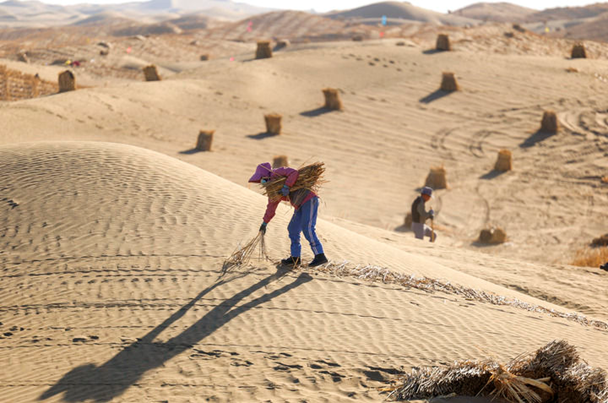 治沙并不是要消灭沙漠,而是治理“人造沙漠”,即荒漠化问题,兴利除害、变废为宝。要想实现人与自然和谐共生的现代化,必须树立全域治沙理念。 在宁夏中卫市沙坡头区长流水村,烈日炎炎,沙海热浪滚滚,大型植保无人机在轰鸣声中起飞,将一捆捆干草吊运至沙丘之上,200多名工人正在抓紧扎草方格。探索科学治沙的脚步没有停歇。宁夏统筹推进山水林田湖草沙一体化保护和系统治理,在中卫市,沿黄河北岸着力打造“光伏治沙示范区”“农田林网标准区”“林区改造先行区”等七大精品示范工程。同时,强化科技支撑,联合科研机构创新应用刷状网绳式草方格、“草方格+沙结皮”等新技术。