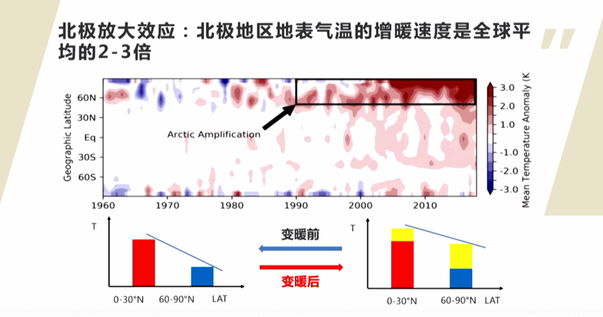 1960年以来,尤其是90年以来。在整个的60度以北就是北极的地区,它是一个显著增长的这么一个现象。我们通过示意图做一个对比,变暖前后的一个对比,红色的代表的是低纬度的这个温度,而蓝色代表的是中高纬度的一个温度。那么这条斜线呢,我们可以表示出南北之间的一个温度的差异,南北之间温度差异的大小就会影响着前面讲过的西风急流的变化。那么变暖之后呢,比如说是黄色的一个变量,我们相当于在中低纬的温度上叠加了一个比较小的一个温度增加,而在中高纬的温度上叠加了一个比较大的温度的一个增加,这样的话,南北之间的温度梯度就变小了。