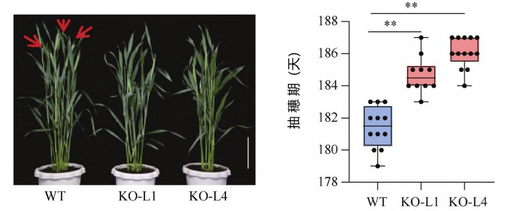 图2 TaEMF2基因编辑植株的表型,红色箭头指向已抽穗的麦穗