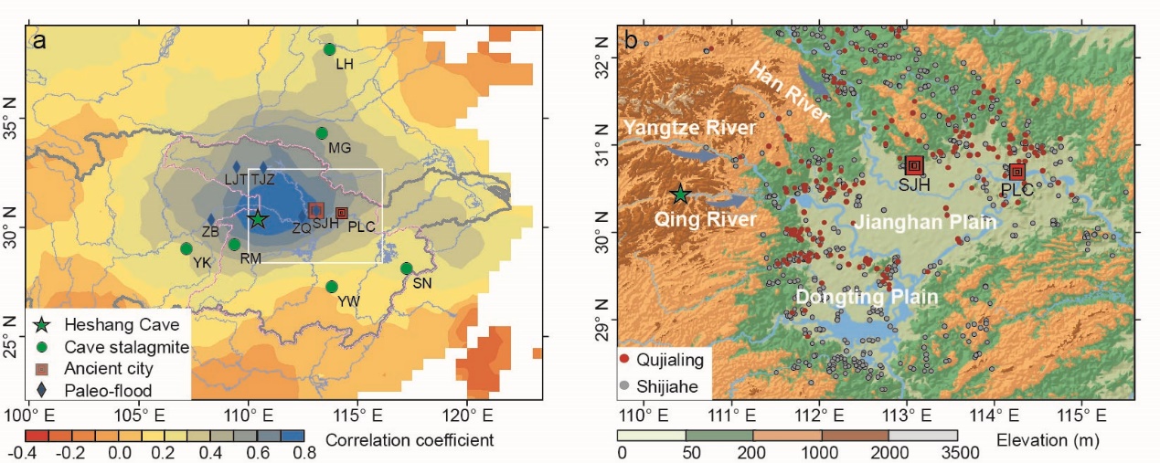 图1 研究区位置。(a)古气候记录和古洪水记录分布图,背景颜色代表和尚洞地区与其他地区降水(1950-2016年)的相关性图;(b)屈家岭和石家河文化遗址分布图。