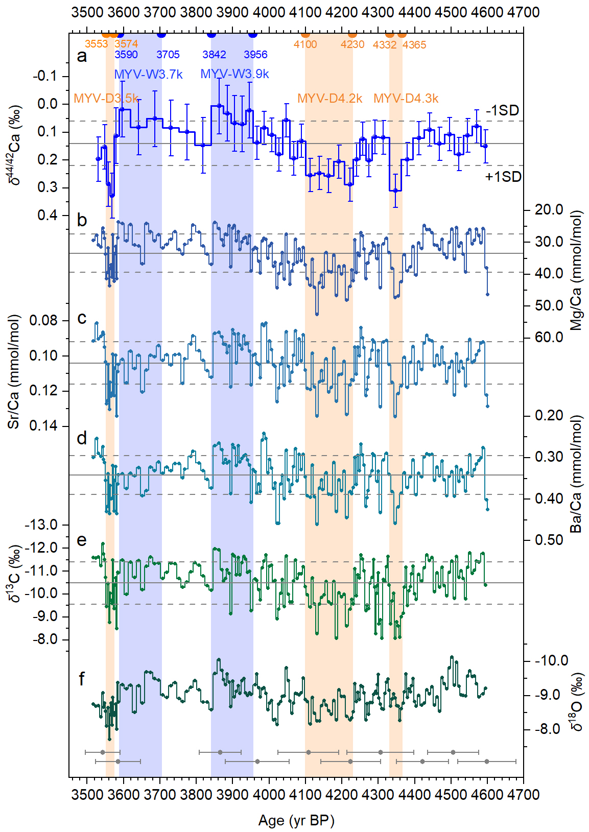 研究采用了多指标协同的分析策略(图2)。其中,石笋中的钙同位素比值(d44/42Ca)是该次研究的“王牌”指标。其响应气候变化的原理在于降水通过碳酸盐的优先沉积影响钙同位素组成。降雨少,喀斯特系统渗流时间延长,优先沉淀充分,石笋d44/42Ca升高,反之亦然。基于现代洞穴监测工作构建的钙同位素分馏模型、岩溶水文学模型等,建立d44/42Ca和年降雨量关系式,为定量重建中全新世长江中游降水量奠定扎实的基础。重建的结果表明,在距今4600年至3500年间,长江中游地区的平均年降雨量约为850毫米,但存在多年代的波动,表现为三个显著的干旱期和两个湿润期(图3)。干旱期(年降雨量低于700毫米)分别出现在距今大约4360、4230和3570年,持续时间分别为40、150和50年;而湿润期(年降雨量超过1000毫米)出现在距今约3950和3700年,持续时间分别为140年和80年。