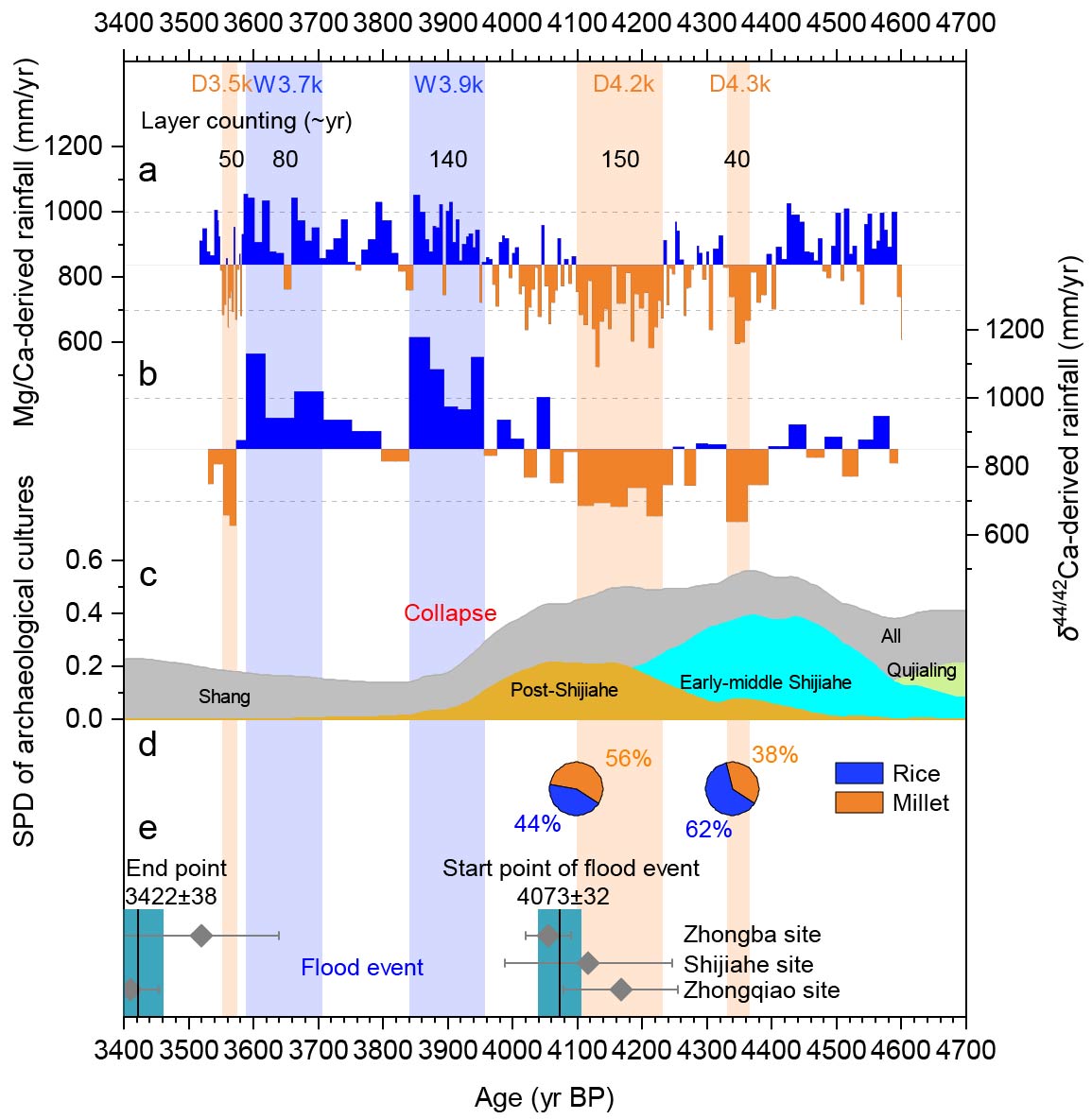 图3 和尚洞水文记录与区域考古记录、洪水记录对比。(a-b)基于HS4石笋δ44/42Ca和Mg/Ca指标定量重建区域降水;(c)长江中游考古文化求和概率(SPD)分布曲线重建区域人口密度;(d)石家河中早期和后石家河文化时期的稻作和旱作作物占比图;(e)长江中游地区与石家河文化衰落相关的