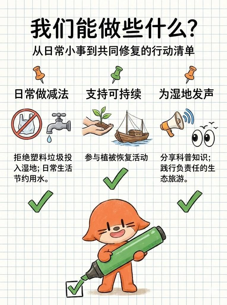 我们可以在生活中减少塑料使用、节约水资源。同时,在旅行时遵守规定,不破坏湿地生态,对湿地动植物做到“不打扰、不破坏”。