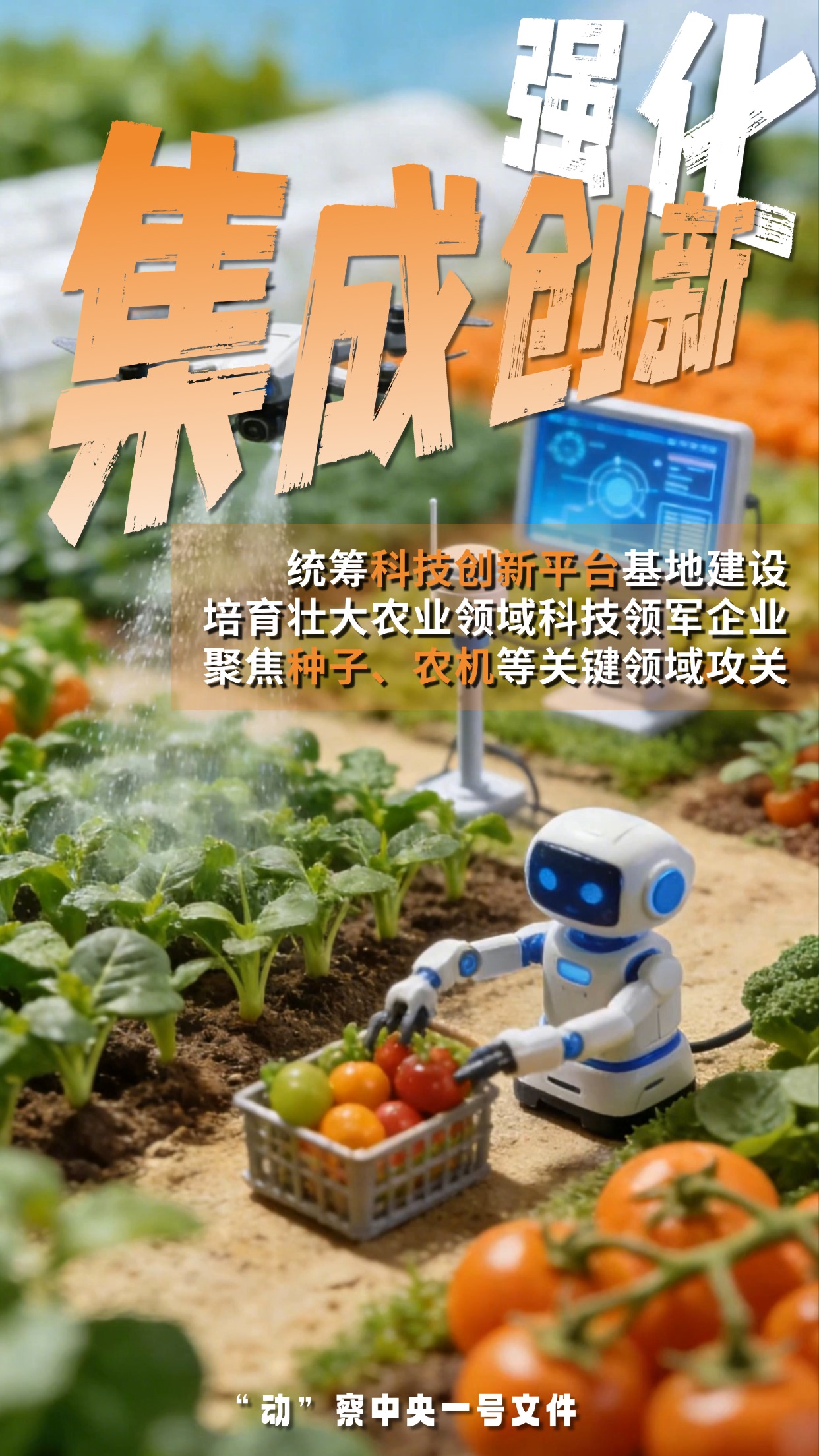 编者按:《中共中央、国务院关于锚定农业农村现代化、扎实推进乡村全面振兴的意见》公布,文件提出“促进人工智能与农业发展相结合,拓展无人机、物联网、机器人等应用场景”。这是无人机和机器人首次写入中央一号文件。新农具如何激活农业新质生产力?一组海报看个明白!