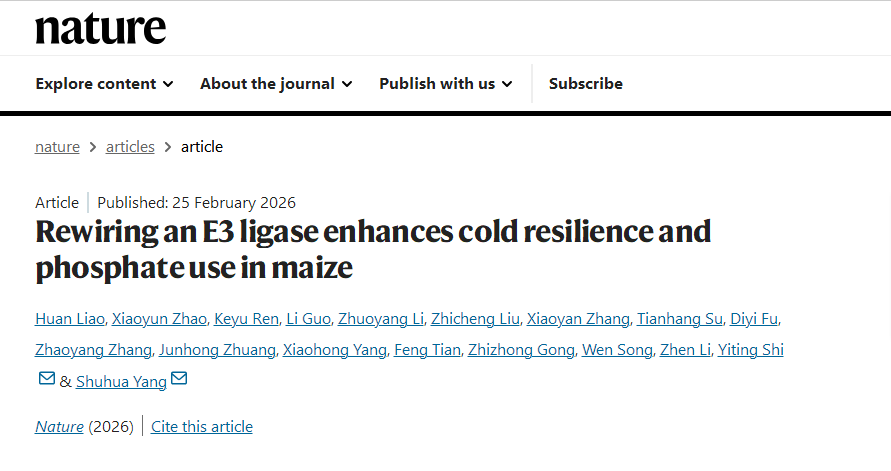 如今,这个难题被我国科学家成功攻克。2月26日,中国农业大学生物学院植物抗逆高效全国重点实验室杨淑华教授和施怡婷教授团队在Nature发表题为“Rewiring an E3 ligase enhances cold resilience and phosphate use in maize(中文翻译:重构E3泛素连接酶协同增强玉米耐冷性和磷利用效率)”的研究论文。该研究找到了玉米细胞里的“智能开关”,E3泛素连接酶NLA(NITROGEN LIMITATION ADAPTATION),对其进行精密的“基因手术”,实现了NLA蛋白功能的定向优化与精准重塑,让玉米从此既能抗寒,又能高效吸磷。