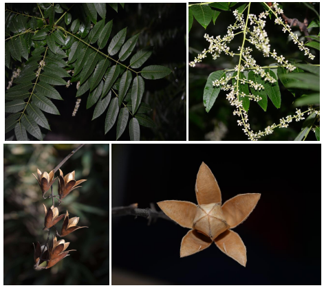 香椿的羽状复叶(左上)、花(右上) 与果实(左下及右下)(图片来源:寻路路)