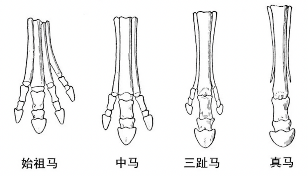 马是奇蹄目动物,只有一根单趾——马蹄。但是几千万年前,马的祖先——始祖马可是有四根脚趾的。在演化过程中,为了获得更高的奔跑效率,这四根脚趾外侧的三根逐渐退化消失,仅保留了中间的那根脚趾(第三趾)。