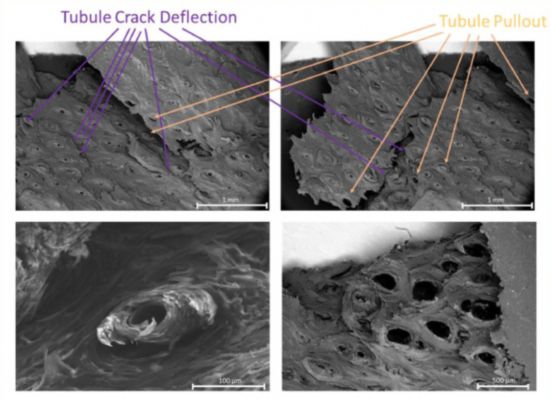 蹄壁内部呈规律状排列的管状结构,像一堵结实的“路障墙”,受到冲击会形成细小的裂纹,而在“路障墙”的阻拦下这些裂纹会发生偏转,从而将这股冲击力分散。