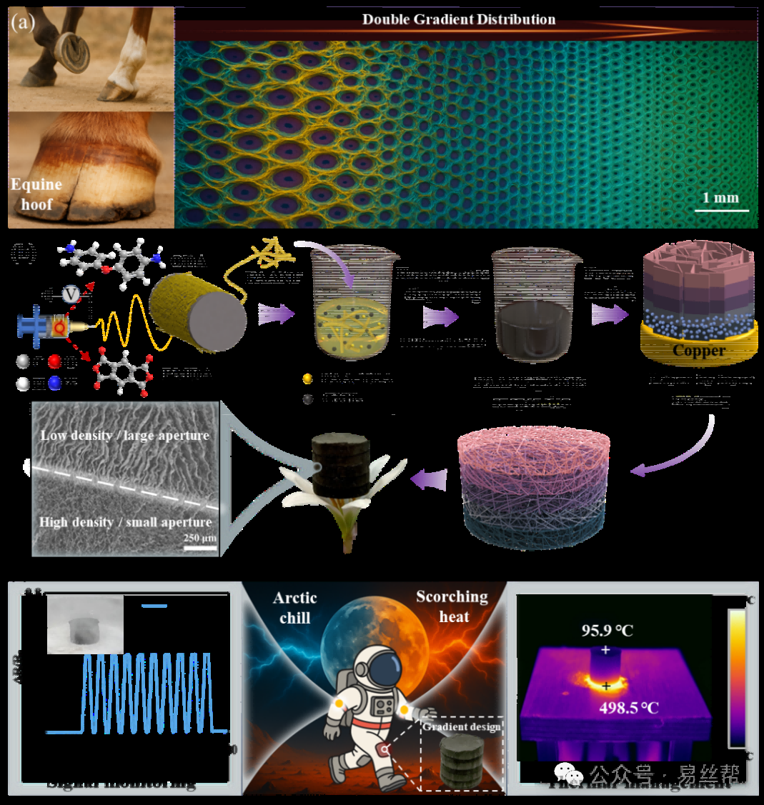 东华大学通过研究模仿马蹄的刚度梯度特性,成功制备出一种聚酰亚胺纳米纤维/碳纳米管双梯度气凝胶——顶部大孔区极易变形,负责捕捉微小压力,提供高灵敏度;底部小孔区刚性较强,负责承载大压力,提供宽量程。这种设计实现了从柔性到刚性的动态转变,巧妙解决了灵敏度和量程之间的固有矛盾。