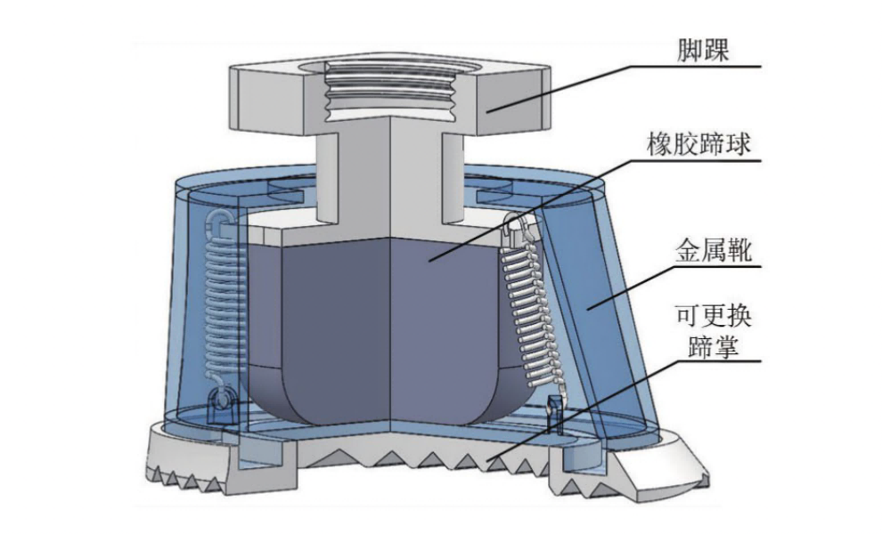 其足端设计包括足体和弹性结构部分,足体的底部轮廓设计成近似椭圆状的仿马蹄形结构,并用弹性结构包覆住足体的底部,形成了“刚性负载+弹性外层”的复合结构,是一种从马蹄形态到功能的仿生设计。